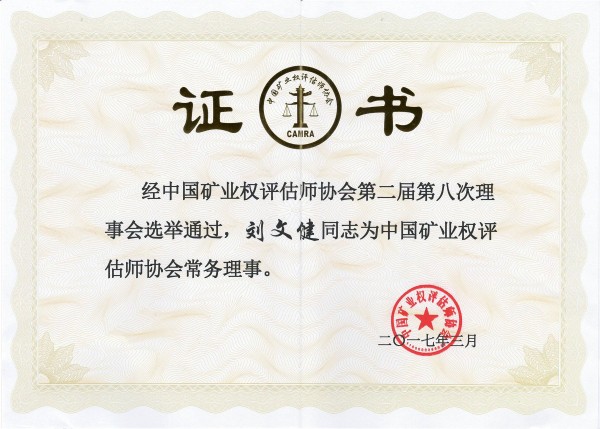 2017年3月,經(jīng)中國(guó)礦業(yè)權(quán)評(píng)估師協(xié)會(huì)第二屆第八次理事會(huì)選舉通過,我公司董事長(zhǎng)兼總經(jīng)理劉文健同志為中國(guó)礦業(yè)權(quán)評(píng)估師協(xié)會(huì)常務(wù)理事。