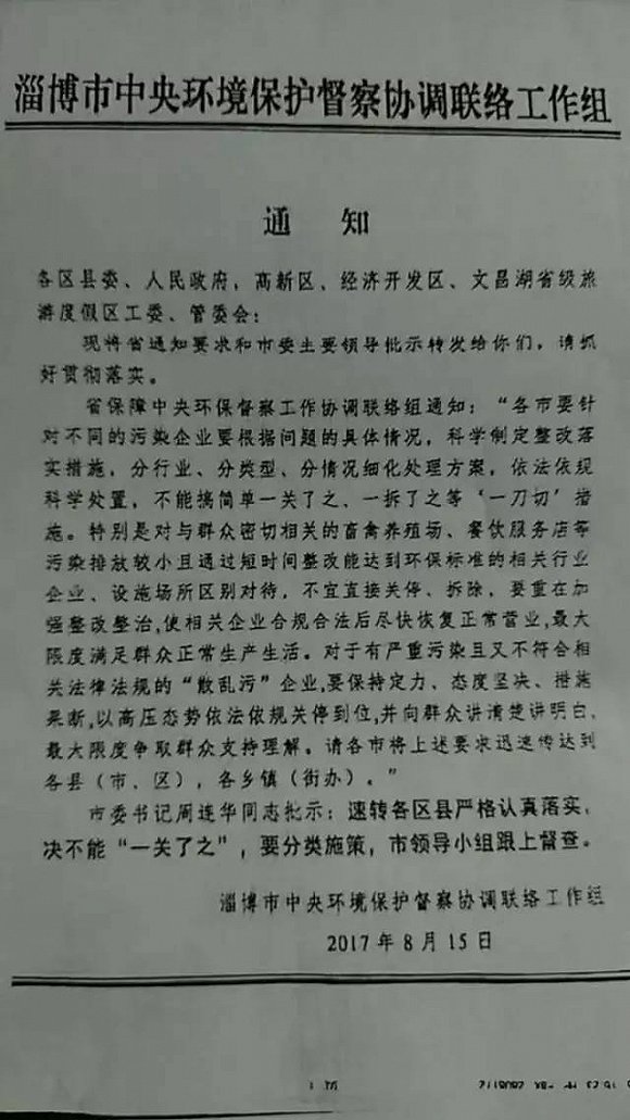 淄博市中央環(huán)境保護(hù)督察協(xié)調(diào)聯(lián)絡(luò)工作組下發(fā)的通知:要求污染排放較小 且通過短時(shí)間整改能夠達(dá)到環(huán)保標(biāo)準(zhǔn)的相關(guān)企業(yè),設(shè)施場(chǎng)所區(qū)別對(duì)待,不宜直接關(guān)停,拆除,要重在加強(qiáng)整改整治。相關(guān)企業(yè)合規(guī)合法后盡快恢復(fù)正常營業(yè),最大限度滿族群眾的正常生產(chǎn)生活,最大限度爭取群眾支持理解,決不能“一關(guān)了之”!